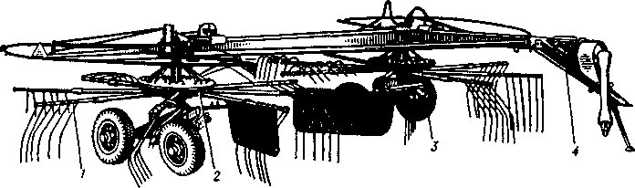 Грабли тракторные ротационные ГВР-6,0: 1 — граблина; 2,3 — роторы; 4 — привод