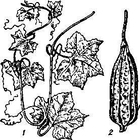 | Люффа гранистая: 1 — часть стебля с листьями; 2 — плод. |