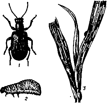 | Пьявица: 1 — жук; 2 — личинка; 3 — повреждённое [поврежденное] растение |