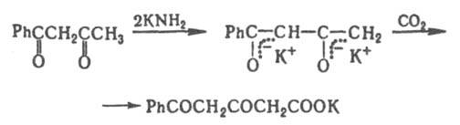При действии избытка сильного основания на 1,3-Д.с., у к-рых имеются a- и g-атомы Н, образуются соли, содержащие дианионы этих Д. с.; в этом случае атака электрофила направляется на g-атом С, напр.: