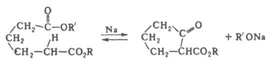 (взаимод. двух молекул сложного эфира с образованием ациклич. кетоэфира). Осуществляется в присут. оснований (щелочные металлы, их гидрооксиды, алкоголяты, амиды, гидриды, реже - трифенилметилнатрий, N-метиланилид лития и др.) в инертной атмосфере в среде эфира или ароматич. р-рителей. Как правило, легко образуются 5- и 6-членные циклы; в условиях большего разбавления возможен синтез макроциклов. Присутствие алкильных групп в a- и b-положениях к карбоксильной группе препятствует циклизации, этоксикарбонильные группы в b-положении облегчают. Из двух возможных продуктов Д. р. образуется преимущественно продукт циклизации с участием метиленовой группы, обладающей более выраженными кислотными свойствами, напр.: