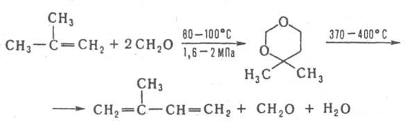 На первой стадии образуется диметилдиоксан. Р-цию проводят в трубчатых реакторах, в к-рые противотоком подают фракцию углеводородов С4 с содержанием изобутилена 40-50% и формалин, содержащий не менее 35% формальдегида; кат. - 1-2%-ная H2SO4. Выход продукта 74-80% по формальдегиду. На второй стадии диметилдиоксан, разбавленный перегретым паром, разлагают в адиабатич. реакторах в присут. кальцийфосфатного кат.; И. выделяют ректификацией. Выход 43-46%.