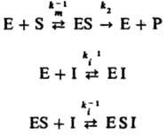 Ингибирование ферментативных реакций м. б. обратимым и необратимым. В обоих случаях И. способен к образованию комплекса с ферментом, но не м. б. подвергнут каталитич. превращению и препятствует образованию комплекса фермент - субстрат. Напр., бутанол ингибирует гидролиз сложных эфиров, катализированный карбоксипептидазой. Различают след. случаи обратимого ингибирования. Прямое конкурентное ингибирование, при к-ром молекулы И. I и субстрата S конкурируют за присоединение к активному центру фермента Е. Процесс описывается соотношениями (Р - продукт превращения):