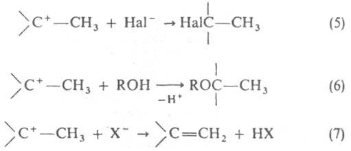 Термин "карбониевые ионы" ("ионы карбония") используют также для обозначения всех К. К. играют важную роль в орг. химии как интермедиаты мн. гетеролитич. р-ций, имеющих теоретич. и прикладное значение (электроф. замещение в ароматич. ряду, электроф. присоединение, нуклеоф. замещение в алифатич. ряду, мол. перегруппировки, катионная полимеризация, каталитич. крекинг и др.). К. обычно образуются при действии электроф. реагентов, напр., протонных к-т, на орг. соединения (как правило, ненасыщенные; ур-ния 1 и 2), при гетеролитич. разрыве связи (3), при разложении диазониевых катионов (4):