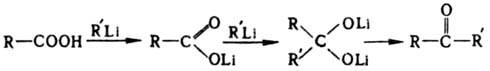 При образовании эфиров увеличение электрофильности карбонильного атома С достигается катализом ионами Н+ или предварит. превращением к-т в производные. Кислотный катализ осуществляется неорг. к-тами, сульфокислотами, катионитами, BF3 и др. В качестве производных используют галогенангидриды и ангидриды к-т, а также реакционноспособные промежуточные соед., получаемые in situ: О-ацилизомочевины (при действии на к-ты карбодиимидов), ацилимидазолиды (при действии N,N-карбонилдиимидазола), N-ацилтиопиридины (при действии дипиридилсульфида и трифенилфосфина), N-ацилпиридиниевые соли (при действии N-галогенпиридиниевых солей) и др. Металлоорг. соед. реагируют с к-тами с образованием на первой стадии солей. Р-ция Li-соли с литийорг. соед. важный метод синтеза кетонов: