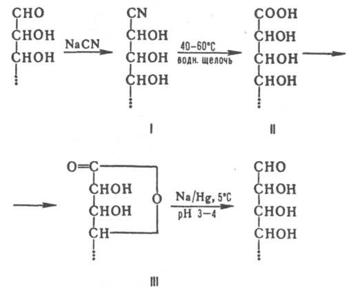 (циангидриновый синтез альдоз), удлинение углеродной цепи алъдоз на одно гидроксиметиленовое звено. Протекает через стадии превращения альдозы в циангидрины, гидролиза последних в альдоновые к-ты и восстановления их лактонов, напр.: