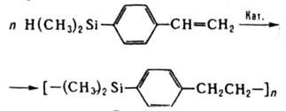 (кат. - соед. Pt и Rh, чаще H2PtCl6.6H2O). Реагирующие группы могут находиться в одном соед. (мономере или олигомере) или в разных. Напр., гидросилилирование n-диметилсилилвинилбензола приводит к образованию полидиметилсилил-n-фениленэтилена: