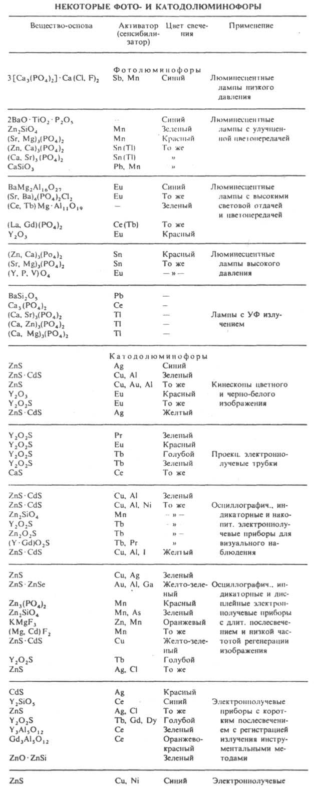 Фотолюминофоры возбуждаются оптич. излучением в диапазоне от вакуумной УФ до ближней ИК области. наиб. широкое применение фотолюминофоры находят в люминесцентных лампах низкого давления. В лампах для общего освещения используют галофосфат Са -3[Са3(РО4)2].Са(Сl, F)2 : Sb, Mn, в лампах высокого давления с исправленной цветопередачей - смеси на основе фосфатов и силикатов, излучающие в синей, зеленой и красной областях спектра. Свечение возбуждается резонансной линией Hg с l = 253,7 нм. Световая отдача (отношение светового потока лампы к мощности) ламп с галофосфатным Л. составляет 85 Лм/Вт, ламп со смесями - от 50 до 60 Лм/Вт. Созданы лампы "нового поколения" с Л. на основе РЗЭ (алюминаты, фосфаты и др.), сочетающие высокую светоотдачу ( ~ 95 Лм/Вт) с высоким качеством цветопередачи. Фотолюминофоры применяют для исправления цветности ламп высокого давления, ламп, излучающих в УФ области, и т.д. (см. табл.).