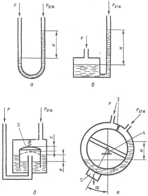 Основные типы манометров: жидкостные (а - U-образный, б, в - чашечные соотв. с постоянным и переменным углом j наклона трубки, г - поплавковый, д - колокольный, е -