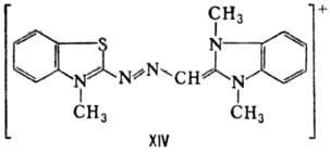 (синий; XII); триметинцианиновые и их азааналоги [напр., розовый (XIII) и желтый
