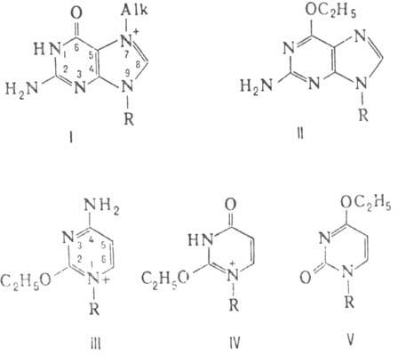 О2-этилцитозин (III), О2- и О4-этилтимины (соотв.