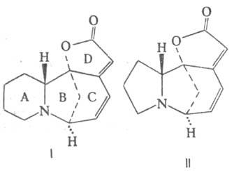 или пирролизидиновый фрагменты. Примерами служат соотв. секуринин (ф-ла I) и