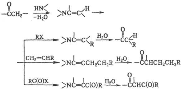 действием на них вторичными аминами (с образованием енаминов), алкилирующими