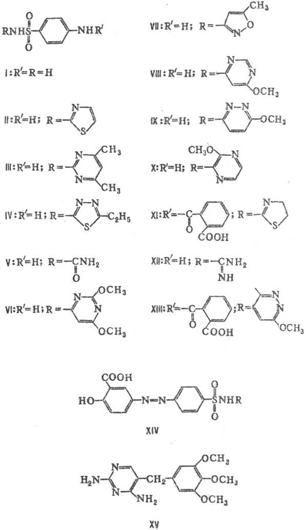 К ним относят стрептоцид (сульфамид; I), норсульфазол (II), сульфадимезин (III),
