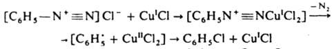 Предполагаемый механизм замены диазогруппы на галоген включает образование лабильного комплекса диазоний-катиона с солью Cu(I) (лимитирующая стадия), напр.: